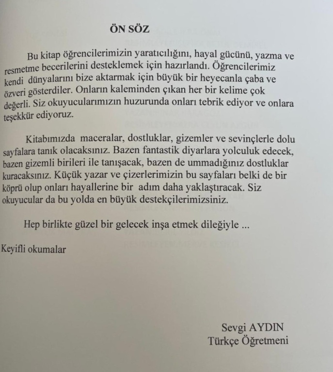 Bir grup ortaokul öğrencisiyle yürütülen bu yaratıcı projede, öğrenciler hem kendi hikâyelerini yazdı hem de her bir hikâyeyi kendi çizimleriyle resimledi. Sürecin her aşamasında aktif rol alan öğrenciler, yazma ve görsel ifade becerilerini bir araya getirerek özgün bir hikâye kitabı ortaya çıkardı.